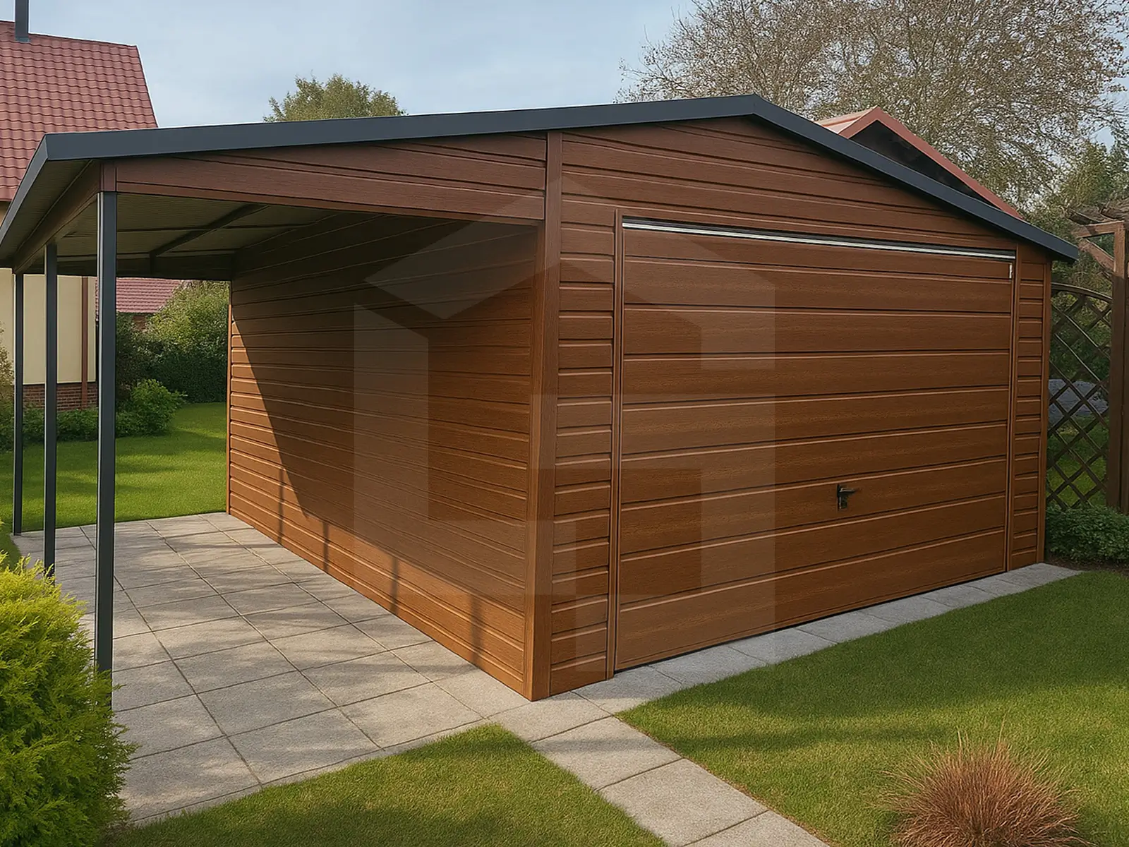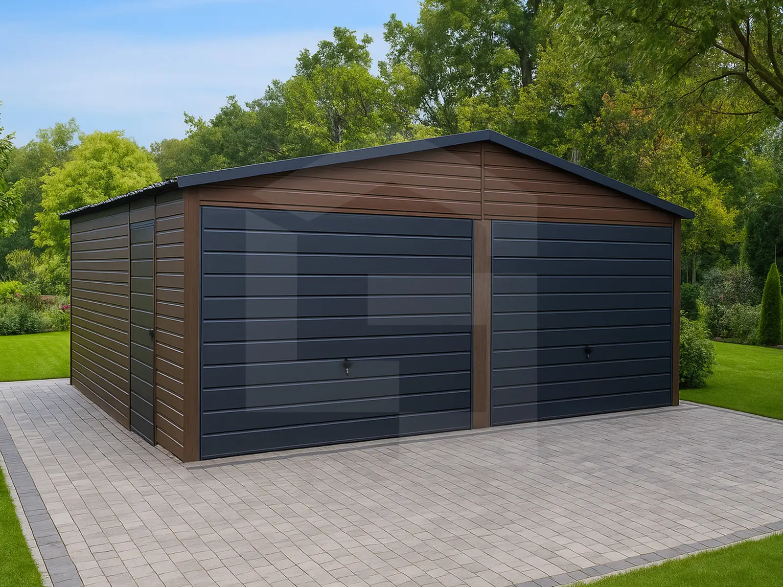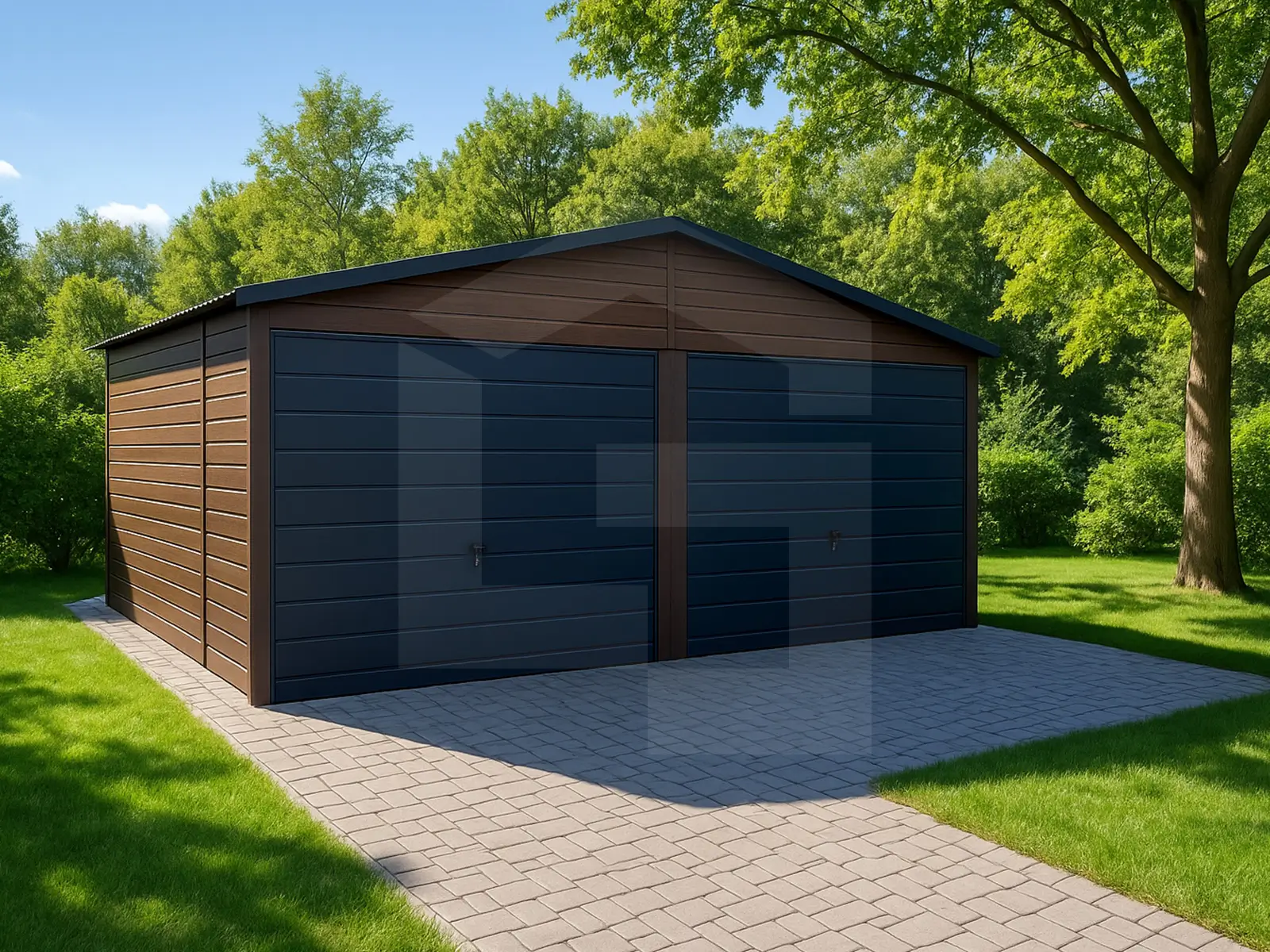 Garaże blaszane drewnopodobne, których wykończenie w strukturze drewna pozwala uzyskać elegancki, naturalny wygląd, bez konieczności konserwacji jak w przypadku konstrukcji drewnianych. Kolory takie jak orzech czy złoty dąb świetnie wpisują się w architekturę nowoczesną i klasyczną. To popularny wybór osób, które chcą, aby garaż stał się wizualnym przedłużeniem domu lub altany ogrodowej.
