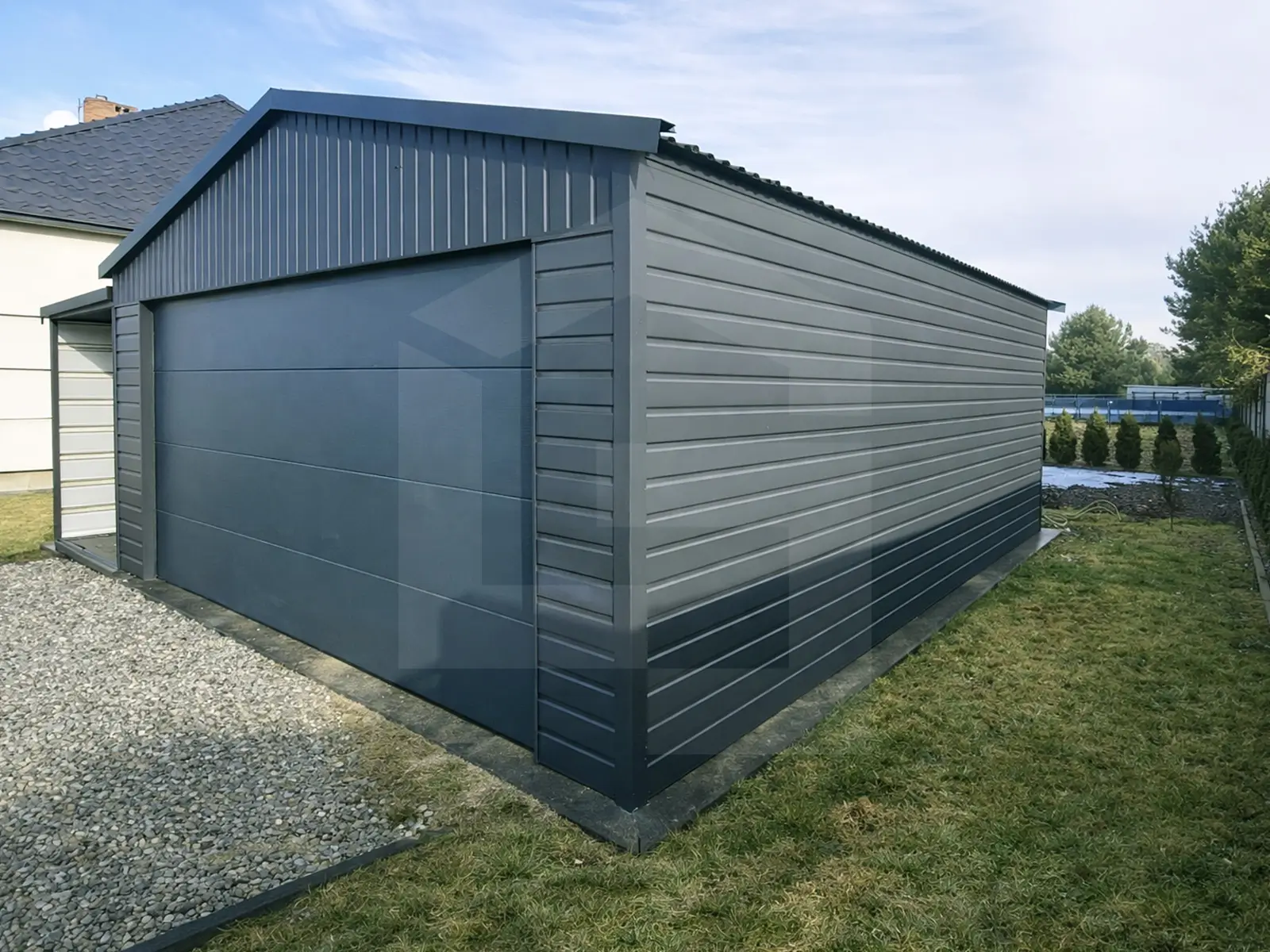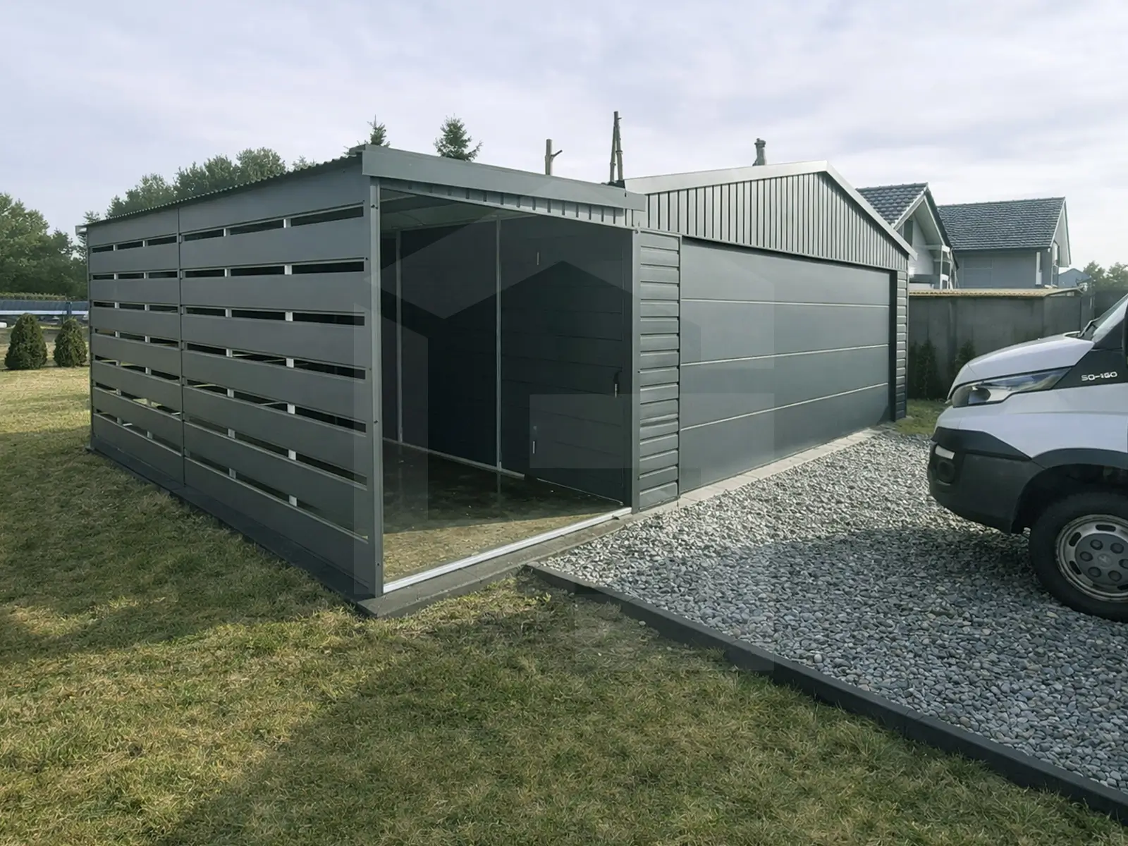 Garaż blaszany z bramą segmentową 6 x 5 z wiatą 2 x 5 – antracytowy zestaw do nowoczesnej posesji